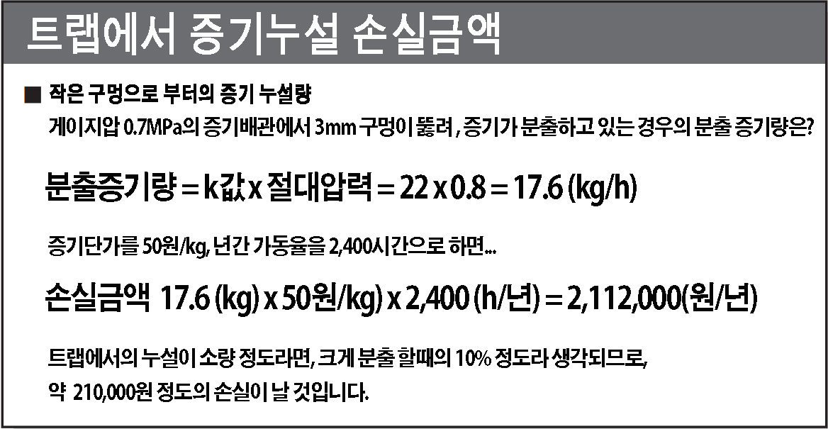 이익을 추구하려면 작은 구멍(소공小孔)에서 누설되(새)는 증기・증기배관과 증기트랩에서의 방열손실을 생각해야 합니다.