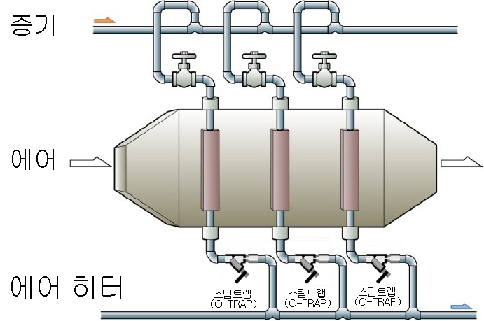 증기는 공기를 가열하는 데 사용됩니다.