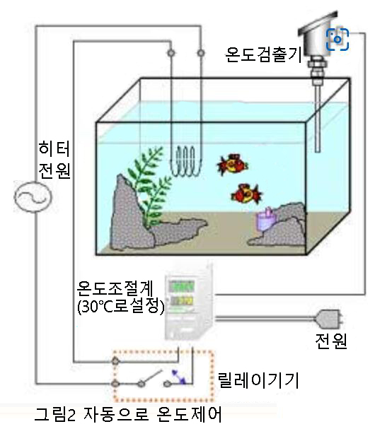 사람의 손을 거치지 않고 자동으로 수조의 온도를 30℃로 일정하게 유지하기 위해서는, 손으로 히터 스위치를 켜는 대신에 그림 2와 같이 온도 조절계를 이용합니다. 또한, 유리 온도계 대신에 온도 검출기를 설치합니다.