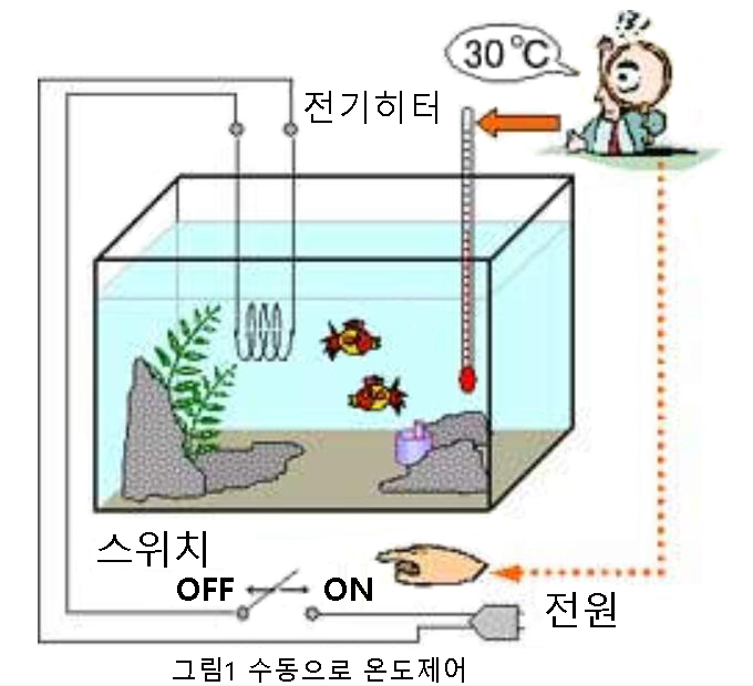 일반적으로 온도 제어란 어떤 기능을 갖고 있으며, 어떤 조작이 이루어지는지를 그림 1에 나타내는 열대어를 사육하는 경우를 예로 생각해 봅니다. 열대어가 육성하는데 가장 적합한 수온을 30℃로 하고, 유리 온도계를 보면서 수조 안에 있는 전기히터의 스위치를 켜고 수조의 온도를 일정하게 유지합니다.